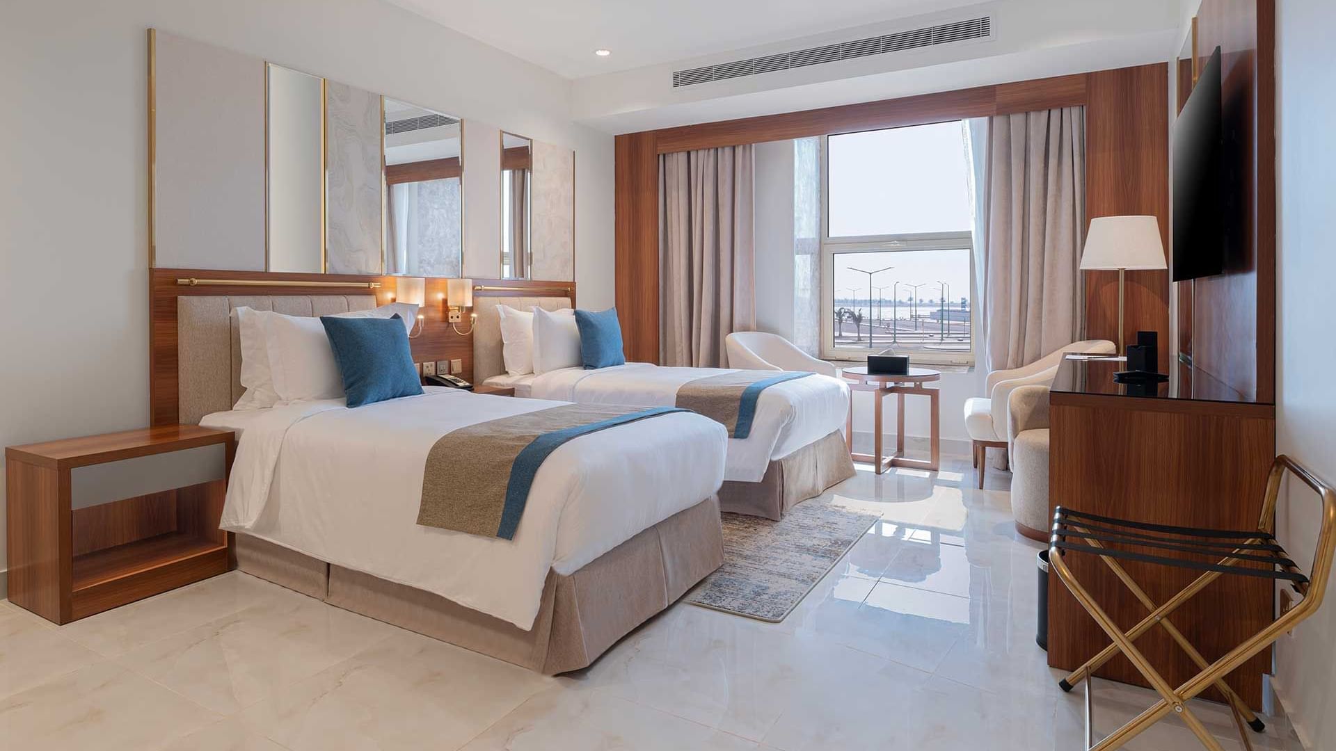 Bask in the breathtaking Red Sea view from this lavish suite featuring two plush single beds and upscale amenities. Area and View: 60 square meters with city view